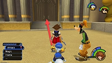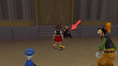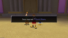Sora & co. receive a Hero's License and are dubbed "junior heroes" by Phil. Exit the lobby and approach Cloud, who is sitting on the steps across from the vestibule; he will teach Sora the special ability Sonic Blade. You can now return to the gummi ship through the large doors behind you and travel to the world on the right.