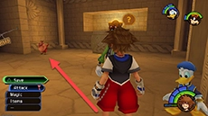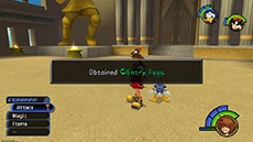 Exit the lobby through the large doors behind you and Sora will encounter Hades, who will give him an Entry Pass into the games. Return to the lobby, equip as many curative items as possible, and save your progress at the nearby save station. Talk to Phil to begin competing in the preliminaries.