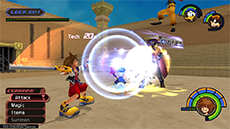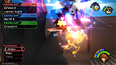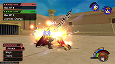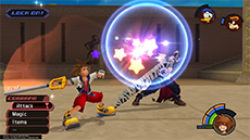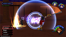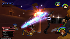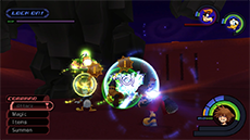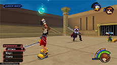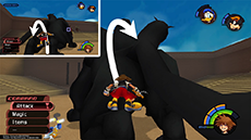 It's recommended to target and defeat Cloud first, as he can more quickly close the distance between himself and Sora. There are two solid strategies to knocking down Cloud's HP without taking damage: [1] If you have the Guard ability equipped, you can use it to break Cloud's forward thrust attack (you'll need to guard against it twice in a row), then immediately follow up with a complete ground combo. [2] Use Dodge Roll to evade Cloud's vertical sword strike, then strike him twice and dodge roll away to safety.