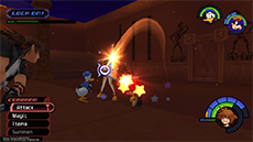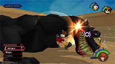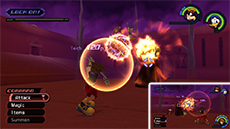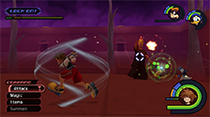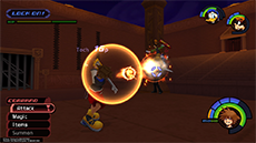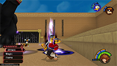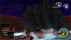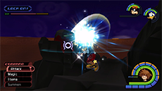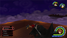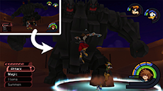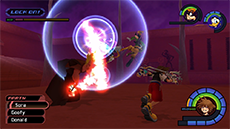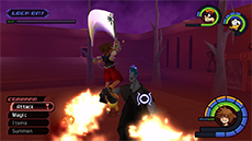 Hades has an immense amount of HP; you won't see his HP bar depleting until you have landed enough hits on him. He typically starts the fight by approaching you while sending flames out from his hands; run away from him until his arms move apart, then jump toward him and strike with a complete air combo. Hades's attacks pack quite a punch, so it's recommended to keep Aero magic active on Sora. Blizzard magic can be used to stagger Hades as well.