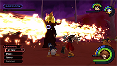 Cerberus begins by walking around, spitting fireballs that track you; Dodge Roll around him in a tight circle to avoid damage. Alternatively, you can deflect the fireballs back at the heads using Guard or a well-timed attack to deal a little damage. After a short while, Cerberus will settle down and remain stationary, attempting to bite you using one head at a time or all three together; after each bite, strike one of the outer heads twice with the Keyblade and back away to avoid taking damage (try not to complete your combo, as Cerberus may attack before you can complete it).