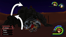 When the fight begins, immediately run to the side to avoid the its first pounce attack. The Behemoth is only vulnerable to damage at the horn on top of its head. Lock-on and cast Gravity magic to cut a decent amount of HP (this is more effective when equipped with an MP-boosting keychain and accessories). You can jump onto its back by using its back legs as platforms. Lock-on to its horn and attack relentlessly.