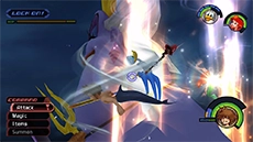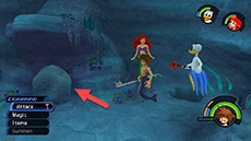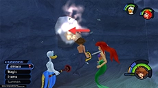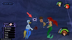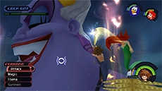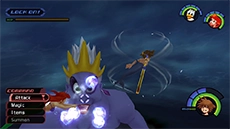 After enough magic has been cast, the cauldron will erupt with light and Ursula and her eels will be temporarily dazed during this time. Use this opportunity to attack Ursula up close and relentlessly with the Keyblade. When Ursula recovers, swim away to avoid her spinning attack, then return to casting magic on the cauldron. If you run out of Ethers, you can strike Flotsam and Jetsam up close to restore your MP more quickly.