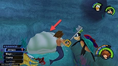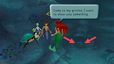 Leave the Grotto and defeat all of the Heartless in the Undersea Gorge. When the area is clear of enemies, approach the Dolphin and Grab On to it for a few seconds, then press the
