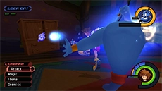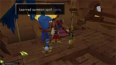Genie joins the party as a summon after defeating Jafar Genie at the end of the story episode in Agrabah. When summoned, Genie uses a variety of offensive magic spells and bullets to aid Sora in battle. To use Genie's abilities, you must first lock-on to enemies using the