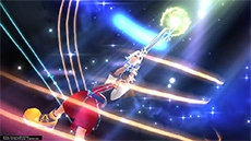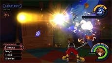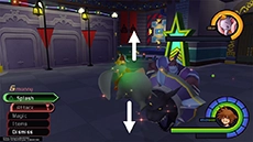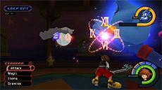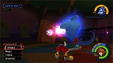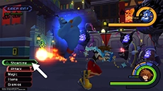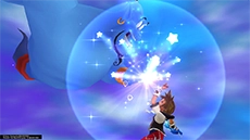 After locking onto targets, activate Showtime: Genie will cast one of six offensive spells/bullets on each target; each attack type is chosen at random. Genie's magic is effective when fighting larger groups of Heartless, but can deal decent damage to some boss enemies as well. Costs 2 MP.