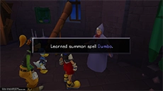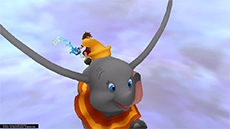 Dumbo is acquired as a summon by giving the Fairy Godmother the Watergleam summon gem. This item is found within a chest inside the Mouth area of Monstro; you will need High Jump in order to reach it. When summoned, Sora will ride Dumbo and guide him toward enemies; press the