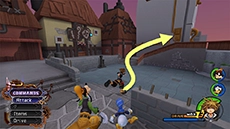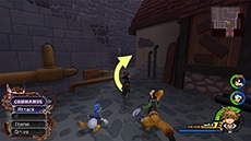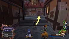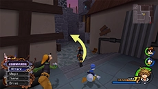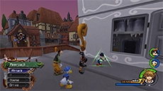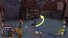 After speaking with Scrooge, travel past Dewey's Item Shop and down the steps to reach the Borough. You'll need to work alongside your party members to defeat the Nobodies that appear. Use the Reversal reaction command to temporarily daze enemies; you can strike twice and repeat the reaction command until the lesser enemies are defeated.