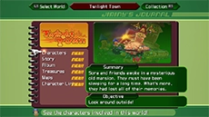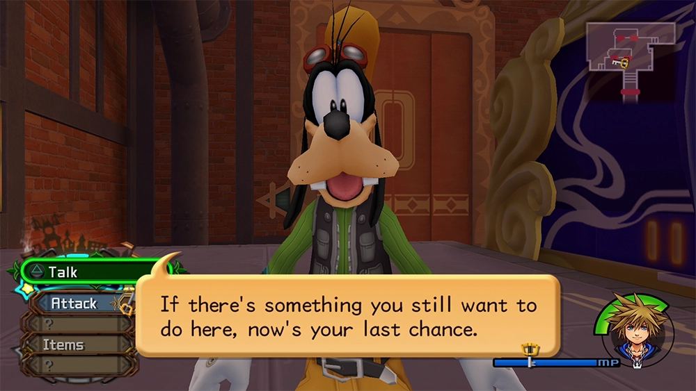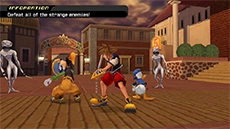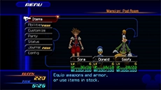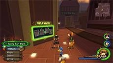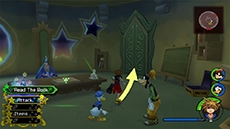 After several cutscenes, you will gain control of Sora, and Donald & Goofy will be added to your party. Jiminy's Journal is now accessible via the main menu going forward; it includes lists of treasures and maps available in each world, along with summaries of the story so far and hints on what to do next.