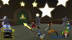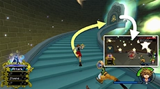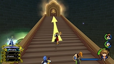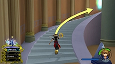 As you climb the Wayward Stairs, you'll encounter several groups of Shadows and Soldiers. Use complete ground combos to deal damage to nearby enemies, and keep an eye out for the Cyclone reaction command that you can use when Soldiers are about to attack with their spin strike. Clear the Heartless in the Star Room and Moon Room, then continue up the stairs to reach the Sorcerer's Loft.