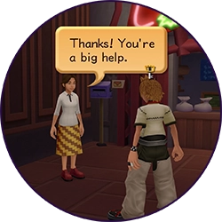 After saving your progress, Roxas will exit the usual spot and receive the Twilight Town Map. Travel uphill and to your left to reach Market Street. Roxas is tasked with earning 800 Munny by taking on odd jobs posted on Market Street. Select Apply For Work at the "HELP WANTED" board in front of Roxas.