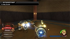 HP: 105 DIFFICULTY: When the fight begins, Axel will ignite the entire floor; making contact with it will damage you periodically. If you get too close to the outer walls, large pillars of flame will erupt from them and damage you if you’re close enough, so try to keep Roxas at least a few steps inside of the walls when navigating around Axel’s attacks.