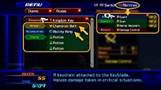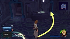 Travel across the second floor to the other side of the mansion and pass through the door at the end of the hallway. After the short cutscene, descend the stairs and travel through the open passageway. Equip any armor (either Medal or Champion Belt) and accessories (only Ability Ring at this point) to Roxas, and be sure to equip Potions in available slots. When you're ready to proceed, Save your progress at the nearby save station and travel through the passageway on the other side of the lab.