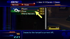 After the cutscene, open the menu and activate your newly-acquired Scan ability, then save your progress at the nearby save station. If you're ready to face Setzer, Talk to the tournament promoter in front of Roxas and select "I'm ready! Let's get started!"