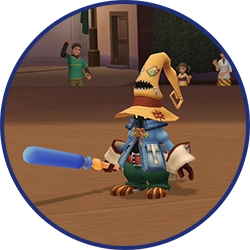 HP: 210 EXP: 0 DIFFICULTY: Hayner likes to approach Roxas and strike with a two-hit combo (a downswing, then an upswing). Staying just outside of his range will give you the time needed to close in afterwards and deal a complete combo. If you're hit by his first downswing, you can avoid his following upswing by standing still (if you try approaching after taking the first hit, you'll always get hit by the upswing).