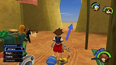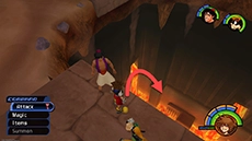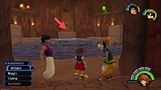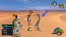 Before heading to the desert, return to Aladdin's house to save your progress and equip curative items. If you feel a bit under-levelled after that fight with the Parasite Cage, you can travel between the areas in Agrabah to defeat Heartless and gain EXP. When you are ready to proceed, return to the desert through the exit in the plaza and approach the large mound of sand.