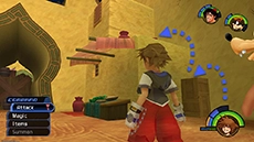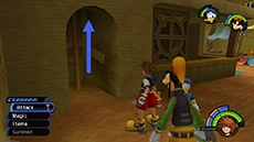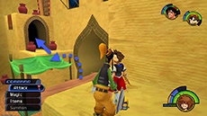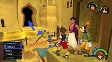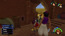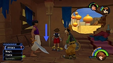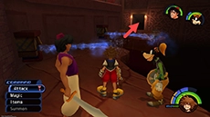 The Heartless have pinned down a magic carpet under a dresser in this house; Move the dresser to free the magic carpet, then exit the house by jumping down from either corner of the room. Enter the alley, located through the passage across from the house you were just in.