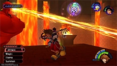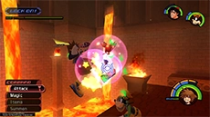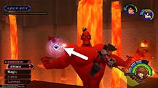 HP: 750 EXP: 730 DIFFICULTY: In this fight, you will need to attack the lamp held by Iago while keeping an eye out for Jafar's attacks. Lock on to the lamp, then jump and strike with air combos. You should also send your party members to attack the lamp by pressing the ![]() ![]() ![]() Jafar likes to pick up and throw large lava rocks at you; these can be deflected with Guard, or you can dodge roll away from them. If you stay too close to Jafar, he will swipe with his arm or strike down with his fist; dodge roll away to avoid these attacks. You can also strike Jafar's arm/hand while he attacks like this to stagger him, but watch out for his laser eyes attack that he follows up with (dodge roll to the sides to avoid it). ![]() ![]() ![]() The lamp is invulnerable to magic attacks, but you can cast your new Blizzara spell directly on Jafar to do a bit of damage. The smaller platforms will move up/down or in/out as you chase down Iago, so try to anticipate where to jump next. Sometimes it's best to wait for Iago to fly across the center platform before attacking. Iago will eventually drop the lamp onto one of the far platforms for a short period of time; take this opportunity to land as many hits on the lamp as possible (he will drop HP and MP orbs as you land combo finishers!). ![]() ![]() ![]() REWARD: Sora learns the magic spell Fira, Ansem's Report 1 |