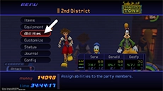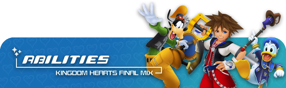 Throughout Sora's journey, the party will learn unique abilities that can be equipped for use in battle. Some abilities are learned through leveling up, while others are taught to your party through storyline events or sidequests.