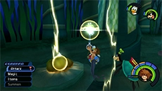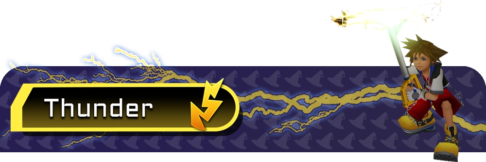 The Thunder spell allows Sora or Donald to call down lightning from above, dealing damage to enemies that are under the casting area; it's effective against most airborne enemies. When upgraded, the spell increases in size, range, and damage. You can also use this spell to activate mechanical parts in certain situations.