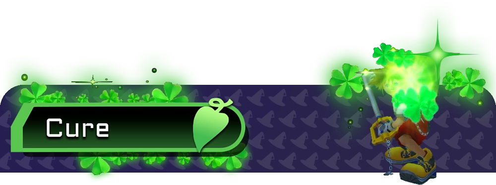 The Cure spell allows Sora or Donald to restore HP for a selected party member. It's wise to cast this spell on Sora when his HP falls near critical levels. Equip the Leaf Bracer ability to avoid interruption of healing when struck by enemies. When the spell is upgraded, the amount of HP restored is increased.