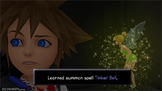 Tinker Bell is acquired as a summon after sealing the Keyhole in Neverland. When summoned, Tinker Bell will periodically heal the entire party over the course of battle, and will remain active until dismissed or if Sora falls in battle. In the event of the latter, Tinker Bell will save Sora from KO and heal him before leaving. Tinker Bell is incredibly useful in long and difficult boss fights. Costs 3 MP.
