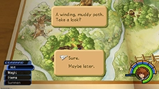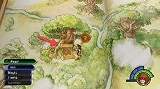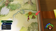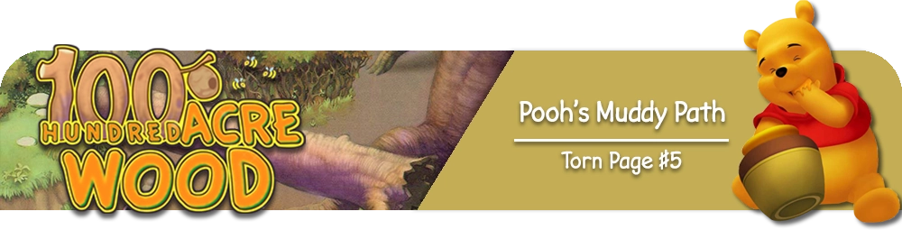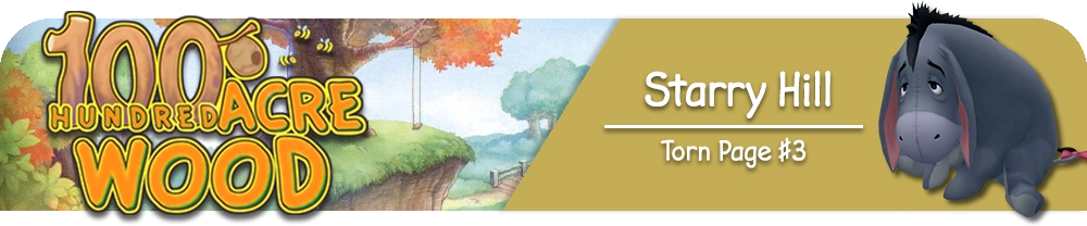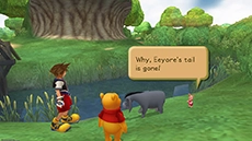 Examine the muddy path on the bottom-left corner of the left page. Enter the area to find Pooh following his own footsteps. Travel around the path to see an opening in the small thicket; Eeyore is inside, trying to find a place for his new home. It appears that the residents of the Hundred Acre Wood are lost, and this is the place where Sora must return everyone that's lost.
