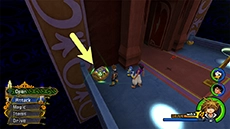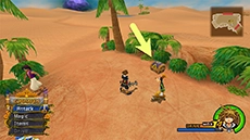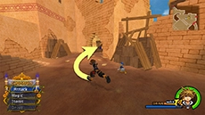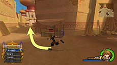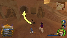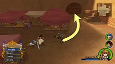 After defeating the Heartless in the Treasure Room, Sora and the party will automatically return to the peddler’s shop in Agrabah. Enter the peddler's shop to Save your progress or visit Mojito’s Moogle Shop to synthesize/purchase items. When you are ready to proceed, exit the shop and travel through Agrabah's northernmost passageway to the Palace.