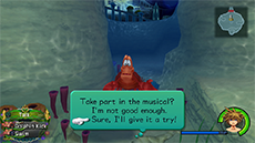 You must get at least one EXCELLENT or GOOD rating from the five available attempts in order to clear the tutorial; if you fail, you can Talk to Sebastian to try again. After clearing the tutorial, Sora will receive the Undersea Kingdom Map. When you are ready to take part in the musical, Talk to Sebastian and select "Sure, I'll give it a try!"