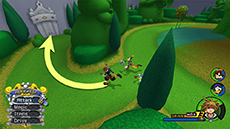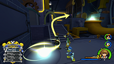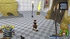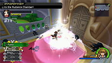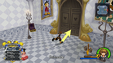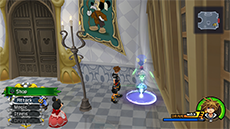 Ascend the steps and cross the hallway to the other end, fighting Shadows along the way; this is a great opportunity to level up your Valor Form Valor Form (it gains EXP from each hit dealt to enemies). Pass through the large doors at the end of the hallway to enter the Library. Save your game at the nearby save station and Approach Queen Minnie. After speaking with Minnie, you will receive the Disney Castle Map.