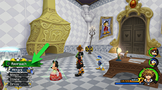 Donald and Goofy will leave your party at this time. You can visit Mogjiro's Moogle Shop in the corner to turn in any acquired synthesis recipes (two can be obtained via treasure chests at this point) and purchase the new Divine Bandanna and Dark Anklet armor pieces, if you wish. Be sure to open the large chest in the northeast corner to obtain Torn Pages. When you're ready to proceed, exit the Library through the large doors on the east wall.