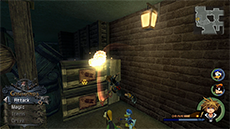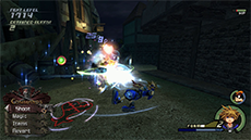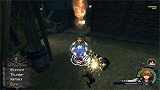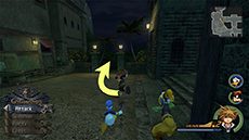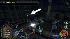 After Pete retreats, enter the town through the passage across the bridge in the southwest. Defeat the nearby Heartless to continue. This is a good opportunity to use magic while in Wisdom Form and earn experience for the form (there should be just enough Heartless here to level it up once!). Watch out for the Heartless-symbol targets on the ground; these indicate where the Cannon Gun's projectiles will land. You can use your new Reflect magic to damage nearby enemies whenever one of the projectiles (or any other attack) makes contact with the barrier.
